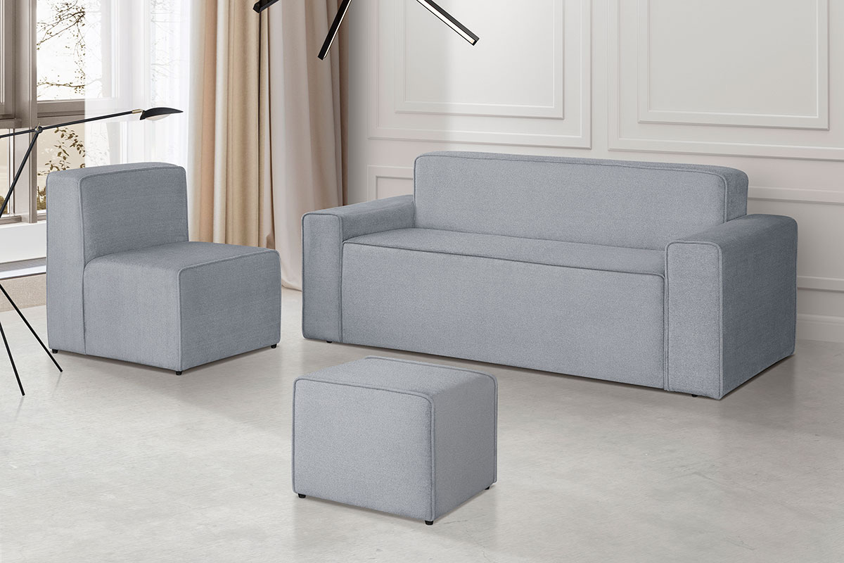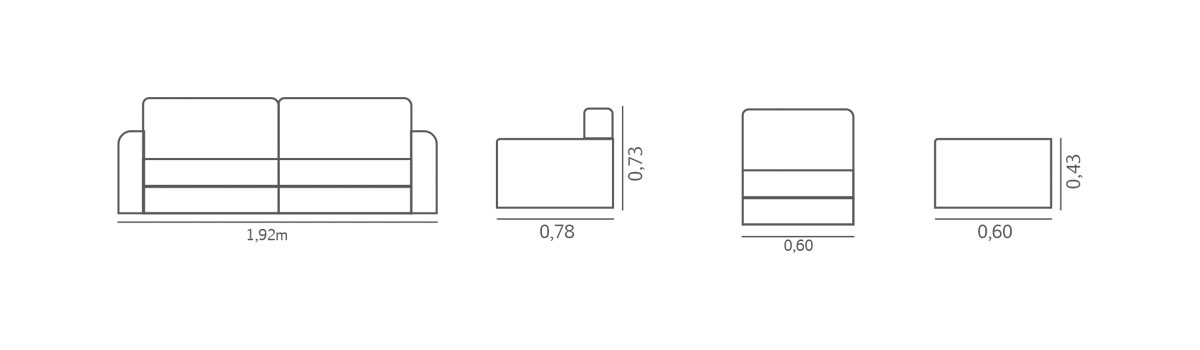 Medidas: Comprimento 3 Lugares - 1,92m Comp. Poltrona - 0,60m Altura - 0,73m Profundidade - 0,78m Comp. Puff - 0,60 x 0,60m Altura Puff- 0,43m